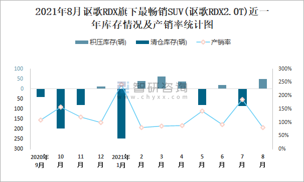 2021年8月謳歌RDX旗下最暢銷SUV(謳歌RDX2.0T)近一年庫存情況及產銷率統計圖