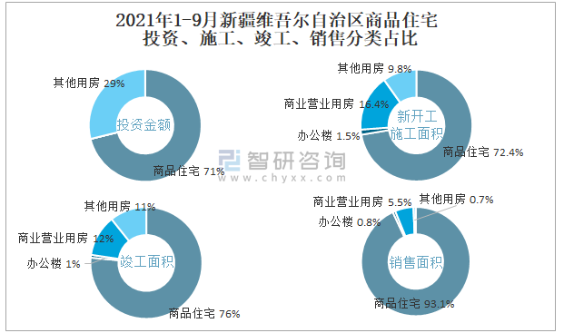 根據國家統計局數據統計可知:2021年1-9月新疆維吾爾自治區房地產開發企業在商品住宅中投資金額占比為71.1%(注:只有投資金額中其他用房包含辦公樓、商業營業用房),商品住宅的新開工面積與竣工面積所占比重差異不大,從銷售面積來看,商品住宅為銷售主力(占比高達93.1%),辦公樓銷售面積占比少于商業營業用房銷售面積占比。