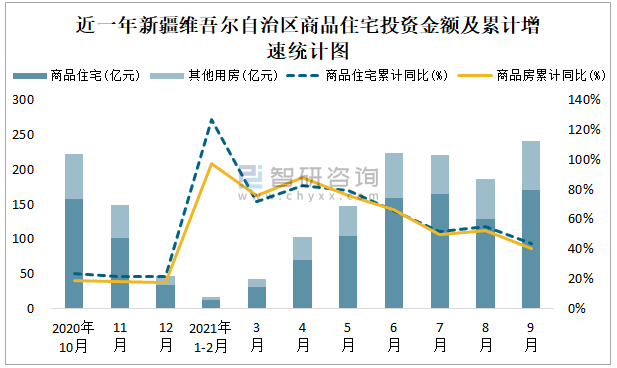 根據國家統計局數據統計可知:2021年9月新疆維吾爾自治區房地產開發投資商品房投資金額為240.25億元(其中商品住宅為170.87億元,辦公樓、商業營業用房等其他用房69.38億元);2021年1-9月新疆維吾爾自治區房地產開發投資商品住宅累計投資金額為840.13億元,投資金額累計同比增長43.6%。