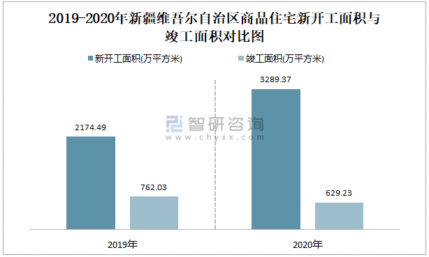 2019-2020年新疆維吾爾自治區商品住宅新開工面積與竣工面積對比圖