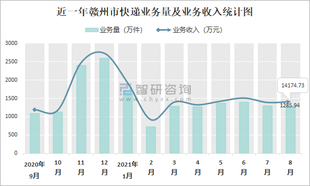 2021年8月贛州市快遞業(yè)務(wù)量與業(yè)務(wù)收入分別為1285.94萬件和14174.73萬元