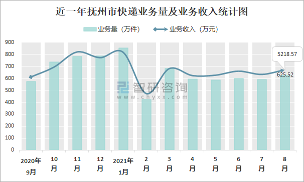 2021年8月撫州市快遞業務量與業務收入分別為625.52萬件和5218.57萬元