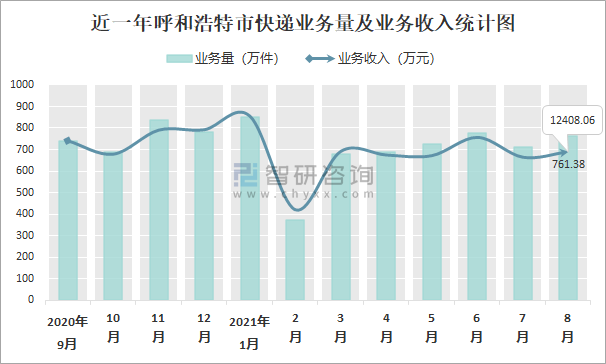 2021年8月呼和浩特市快遞業務量與業務收入分別為761.38萬件和12408.06萬元