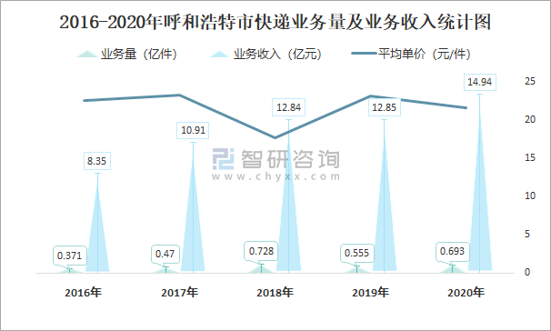 2016-2020年呼和浩特市快遞業務量及業務收入統計圖
