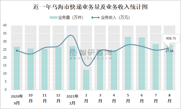 近一年烏海市快遞業務量及業務收入統計圖