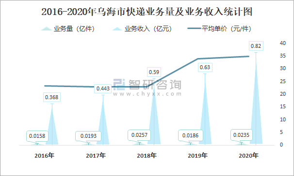 2016-2020年烏海市快遞業務量及業務收入統計圖
