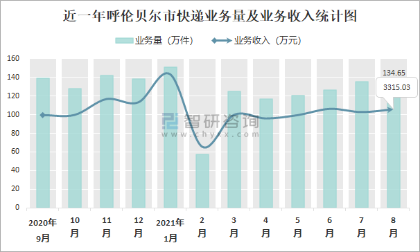 2021年8月呼倫貝爾市快遞業務量與業務收入分別為134.65萬件和3315.03萬元