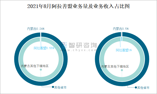 根據各省市郵政局數據可知:2021年8月阿拉善盟快遞業務量占內蒙古快遞業務量的0.55%,內蒙古快遞業務量占全國快遞業務量的0.24%;2021年8月阿拉善盟快遞業務收入占內蒙古快遞業務收入的1%,內蒙古快遞業務收入占全國快遞業務收入的0.5%。