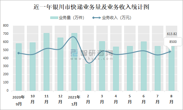 近一年銀川市快遞業務量及業務收入統計圖