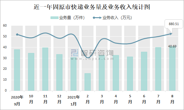 近一年固原市快遞業務量及業務收入統計圖