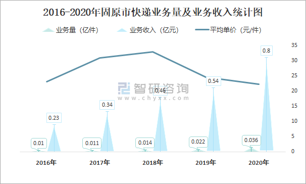 2016-2020年固原市快遞業務量及業務收入統計圖