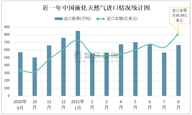 2021年8月中國(guó)液化天然氣進(jìn)口數(shù)量和進(jìn)口金額分別為665萬(wàn)噸和36.38億美元