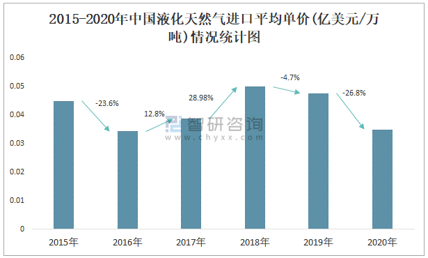 2015-2020年中國(guó)液化天然氣進(jìn)口平均單價(jià)(億美元/萬(wàn)噸)情況統(tǒng)計(jì)圖