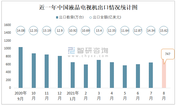 2021年8月中國(guó)液晶電視機(jī)出口數(shù)量和出口金額分別為747萬(wàn)臺(tái)和15.62億美元