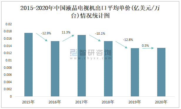 根據(jù)中國(guó)海關(guān)數(shù)據(jù)顯示:2015-2020年中國(guó)液晶電視機(jī)出口數(shù)量總體呈上升趨勢(shì),出口金額在2018年達(dá)到最大值,此后有所下降;2015-2020年中國(guó)液晶電視機(jī)出口平均單價(jià)2017年增長(zhǎng)速度最快,而2016年中國(guó)液晶電視機(jī)出口平均單價(jià)下降速度最快,下滑了12.9%。