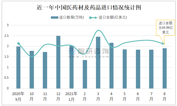 近一年中國醫(yī)藥材及藥品進(jìn)口情況統(tǒng)計(jì)圖