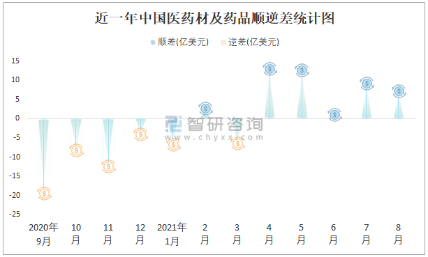 近一年中國醫(yī)藥材及藥品順逆差(億美元)統(tǒng)計(jì)圖