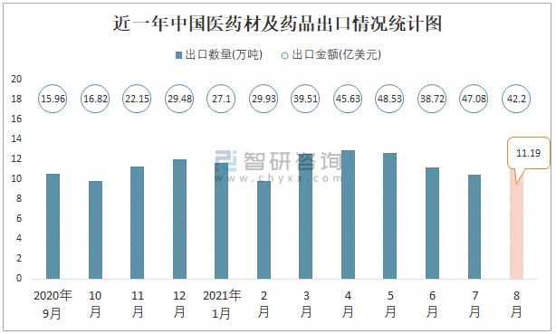 近一年中國醫(yī)藥材及藥品出口情況統(tǒng)計(jì)圖