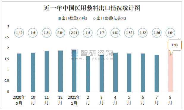 近一年中國(guó)醫(yī)用敷料出口情況統(tǒng)計(jì)圖