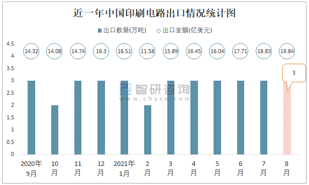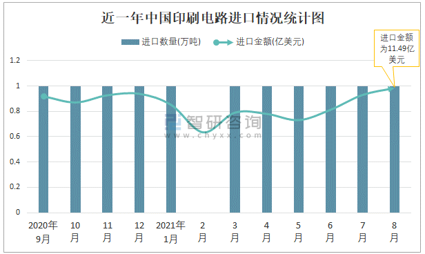 根據中國海關數據顯示:2021年8月中國印刷電路進口數量為1萬噸,同比增長6.3%,進口金額為11.49億美元,同比增長21.5%,2021年8月中國印刷電路出口數量為3萬噸,同比增長34.9%,出口金額為19.84億美元,同比增長50.5%;2021年1-8月中國印刷電路進口數量為5萬噸,進口金額為76.09億美元,出口數量為24萬噸,出口金額為132.84億美元。