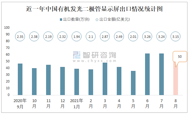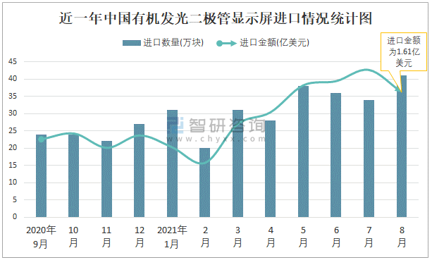 根據中國海關數據顯示:2021年8月中國有機發光二極管顯示屏進口數量為41萬塊,同比增長114.9%,進口金額為1.61億美元,同比增長98.6%,2021年8月中國有機發光二極管顯示屏出口數量為50萬塊,同比增長92%,出口金額為3.15億美元,同比增長94.6%;2021年1-8月中國有機發光二極管顯示屏進口數量為247萬塊,進口金額為10.84億美元,出口數量為370萬塊,出口金額為20.86億美元。