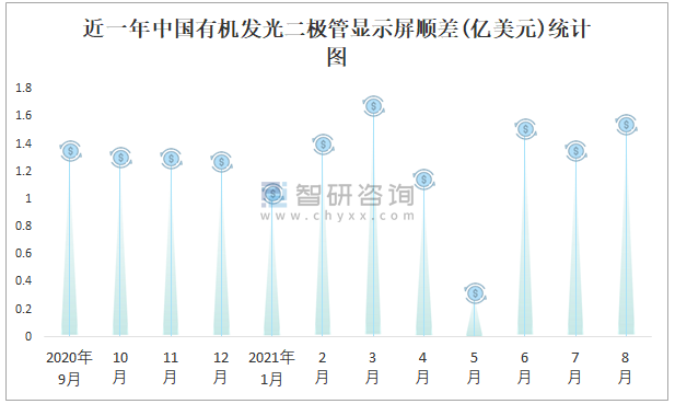 近一年中國有機發光二極管顯示屏順差(億美元)統計圖