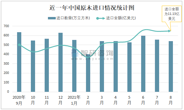 2021年8月中國原木進口數量和進口金額分別為540萬立方米和11.13億美元