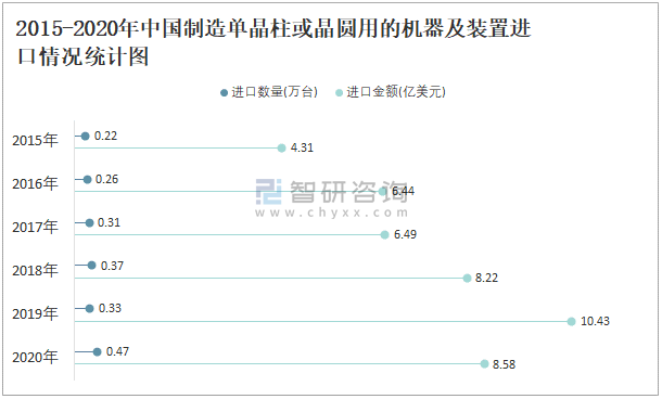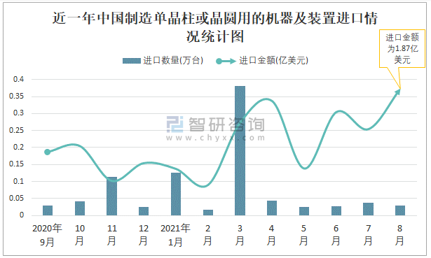 根據中國海關數據顯示:2021年8月中國制造單晶柱或晶圓用的機器及裝置進口數量為0.03萬臺,同比增長96.1%,進口金額為1.87億美元,同比增長242.4%,2021年1-8月中國制造單晶柱或晶圓用的機器及裝置進口數量為0.26萬臺,進口金額為9.56億美元。