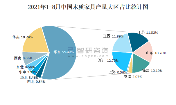 2021年1-8月中國木質家具產量大區占比統計圖