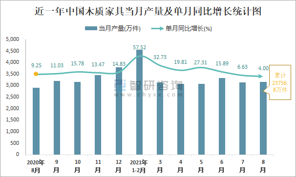 根據國家統計局數據顯示:2021年8月中國木質家具產量為3156萬件,同比增長4%;2021年1-8月中國木質家具累計產量為23756.8萬件,同比增長24.88%;2015-2020年中國木質家具產量2018年跌至最低值,此后呈現遞增趨勢。