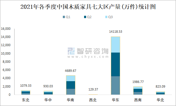 2021年各季度中國木質家具七大區產量統計圖