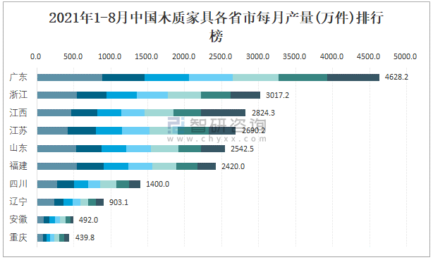 2021年1-8月中國木質家具各省市每月產量排行榜