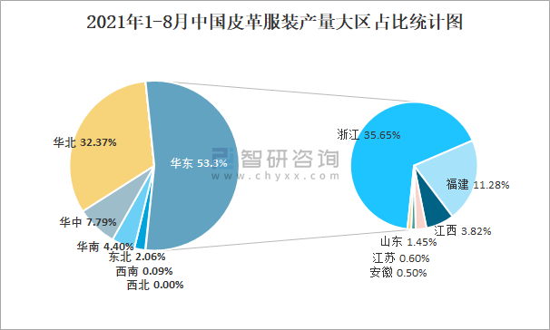 2021年1-8月中國皮革服裝產量大區占比統計圖