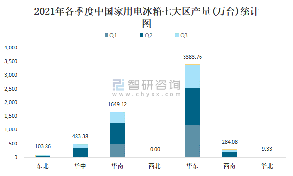 2021年各季度中國家用電冰箱七大區產量統計圖