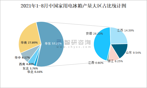 2021年1-8月中國家用電冰箱產量大區占比統計圖