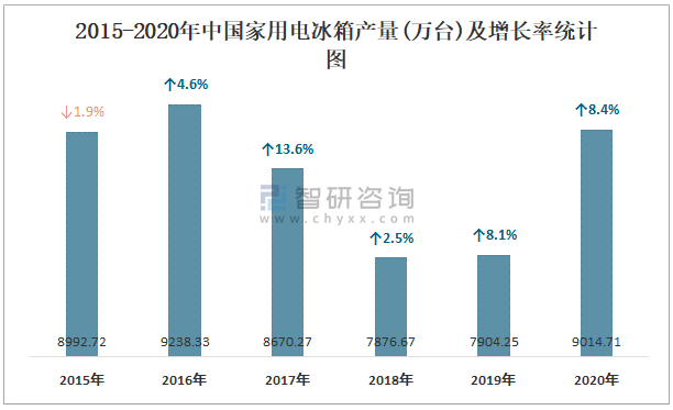 2015-2020年中國家用電冰箱產量及增長率統計圖