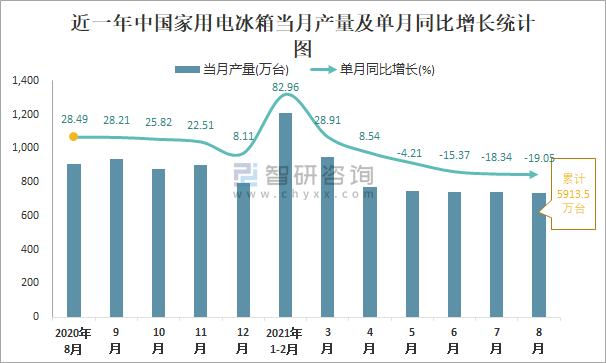 根據國家統計局數據顯示:2021年8月中國家用電冰箱產量為736萬臺,同比下降19.05%;2021年1-8月中國家用電冰箱累計產量為5913.5萬臺,同比增長6.67%;2015-2020年中國家用電冰箱產量2018年跌至最低,此后逐年遞增。