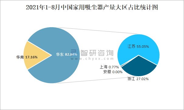 2021年1-8月中國家用吸塵器產(chǎn)量大區(qū)占比統(tǒng)計圖