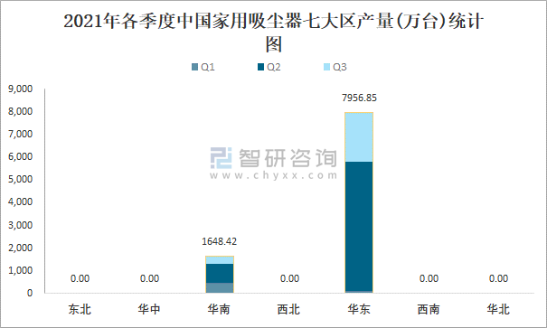 2021年各季度中國家用吸塵器七大區(qū)產(chǎn)量統(tǒng)計圖