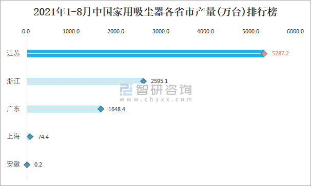 2021年1-8月中國家用吸塵器各省市產(chǎn)量排行榜