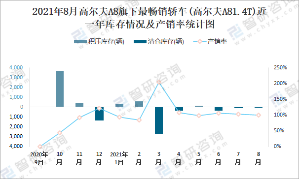 2021年8月高爾夫A8旗下最暢銷車(高爾夫A81.4T)近一年庫存情況及產(chǎn)銷率統(tǒng)計(jì)圖