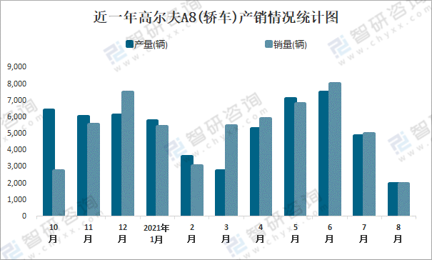 近一年高爾夫A8(轎車)產(chǎn)銷情況統(tǒng)計(jì)圖