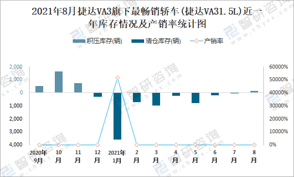 根據中國汽車工業協會數據統計可知:2021年8月捷達VA3(轎車)旗下只有1款捷達VA31.5L轎車在銷售;近一年捷達VA31.5L共清倉庫存3747輛,其產銷率存在一定幅度波動,2021年1月產銷率最高(51442.86%),清倉庫存3594輛,2020年10月產銷率偏低(66.12%),積壓庫存1652輛。