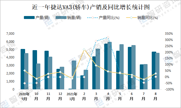 近一年捷達VA3(轎車)產銷及同比增長統計圖