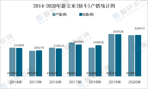 根據中國汽車工業(yè)協會數據可知:2021年8月新寶來(轎車)產量為16987輛,同比下降30.9%,銷量為15782輛,同比下降40.8%,當月產銷率為92.91%;2021年1-8月新寶來(轎車)累計產量為171202輛,同比下降14.8%,累計銷量為176737輛,同比增長0.6%,累計產銷率為103.23%;2014-2020年新寶來(轎車)產銷量均在2019年達到最高值,次年小幅度下滑,且近7年總產量大于總銷量,積壓了庫存2839輛。
