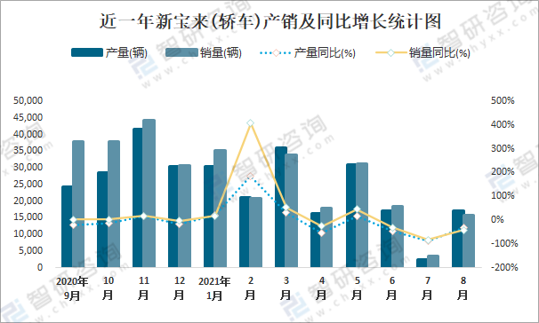 近一年新寶來(轎車)產銷及同比增長統計圖