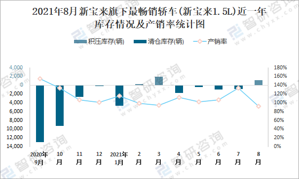 2021年8月新寶來旗下最暢銷車(新寶來1.5L)近一年庫存情況及產銷率統計圖