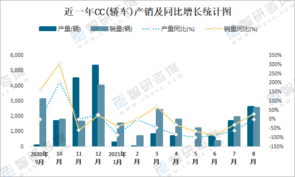 根據(jù)中國汽車工業(yè)協(xié)會(huì)數(shù)據(jù)可知:2021年8月CC(轎車)產(chǎn)量為2615輛,同比下降0%,銷量為2564輛,同比增長29.8%,當(dāng)月產(chǎn)銷率為98.05%;2021年1-8月CC(轎車)累計(jì)產(chǎn)量為6883輛,同比下降67.8%,累計(jì)銷量為12636輛,同比下降29%,累計(jì)產(chǎn)銷率為183.58%;2014-2020年CC(轎車)銷量在2018年跌至最低值,此后總體呈現(xiàn)上升趨勢,且近7年總產(chǎn)量大于總銷量,積壓了庫存5273輛。