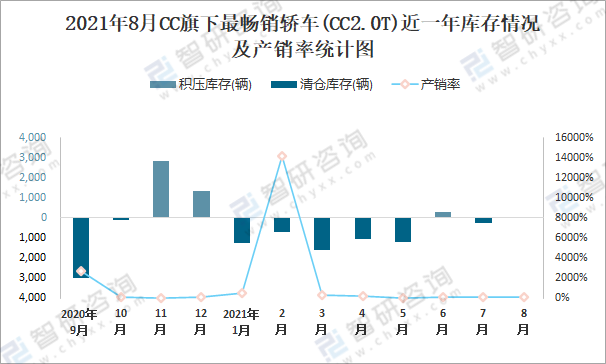 根據(jù)中國汽車工業(yè)協(xié)會(huì)數(shù)據(jù)統(tǒng)計(jì)可知:2021年8月CC(轎車)旗下只有1款CC2.0T轎車在銷售;近一年CC2.0T共清倉庫存4738輛,其產(chǎn)銷率存在一定幅度波動(dòng),2021年2月產(chǎn)銷率最高(14140%),清倉庫存702輛,2020年11月產(chǎn)銷率偏低(37.13%),積壓庫存2835輛。