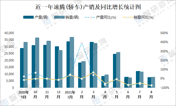 根據(jù)中國汽車工業(yè)協(xié)會數(shù)據(jù)可知:2021年8月速騰(轎車)產量為7600輛,同比下降68.9%,銷量為7631輛,同比下降74.1%,當月產銷率為100.41%;2021年1-8月速騰(轎車)累計產量為145775輛,同比下降19%,累計銷量為149897輛,同比下降11.2%,累計產銷率為102.83%;2014-2020年速騰(轎車)產銷量均在2016年達到最高值,此后總體呈現(xiàn)下降趨勢,且近7年總銷量大于總產量,清倉庫存1072輛。